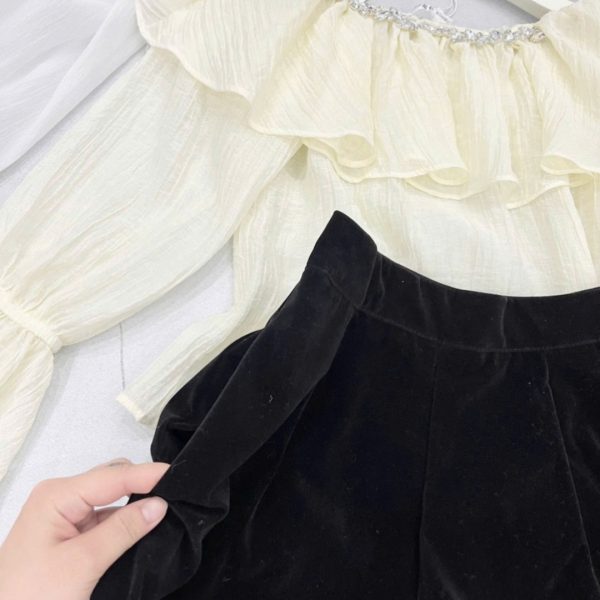 Áo Trễ Vai Tơ Nhăn Viền Đá Tay Xoè Mix Quần Nhung Cạp Cao