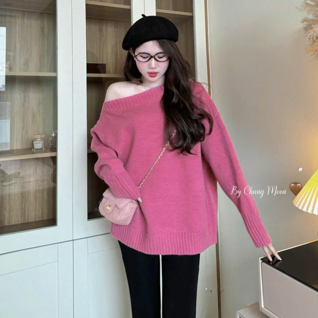 CIMISSHOP – Áo Len Lệch Vai Trơn Dày Dặn Oversize Với Bảng Màu Mới Nhất 2024 Chuẩn WGWE
