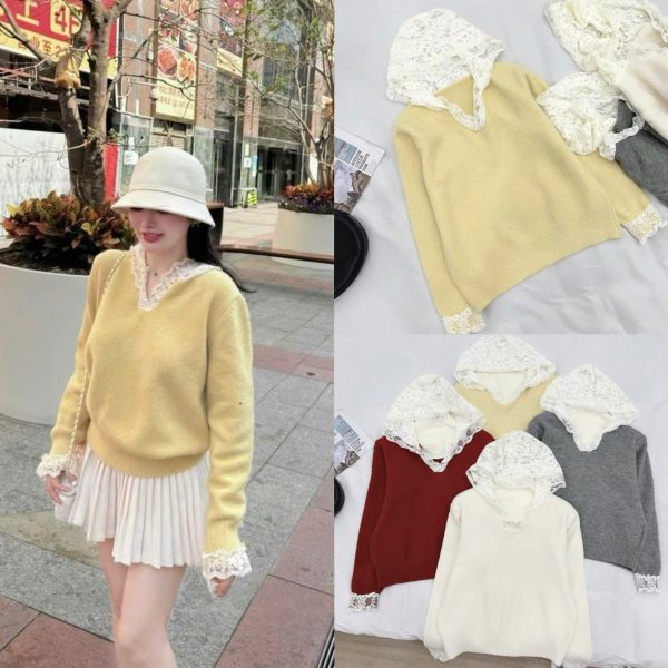CIMISSHOP – Áo Len Nữ, Áo Len Trơn Dài Tay Phối Mũ Ren Nổi Bật Xinh Xẻo Cho Các Nàng
