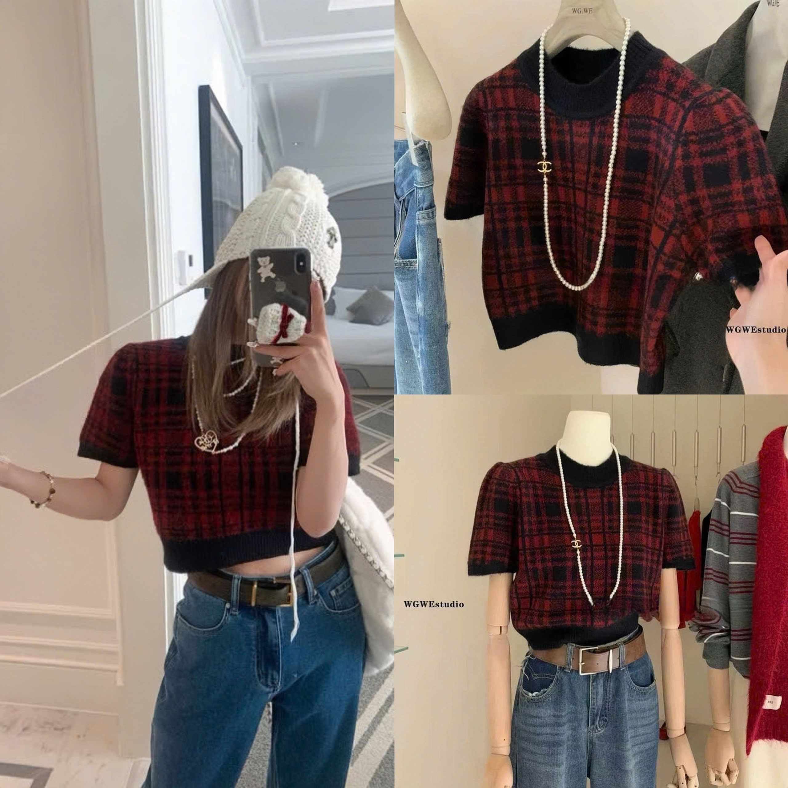 CIMISSHOP – Áo Len Nữ Cộc Tay Kẻ Đỏ Dày Dặn Dáng Croptop Phong Cách Hàn Quốc Hàng WGWE