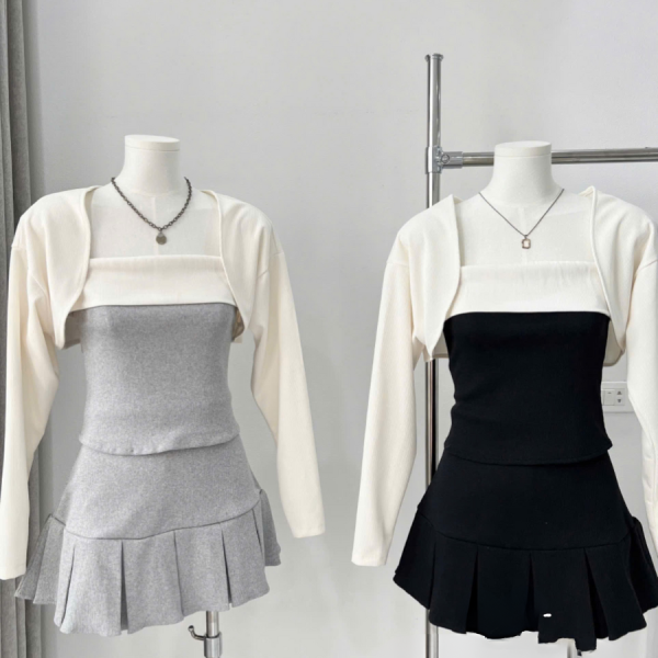 Set 3 Món Tăm Áo Quây Kèm Áo Khoác Ngoài Mix Chân Váy Xếp Ly Xoè 2 Màu (chân váy có lót)