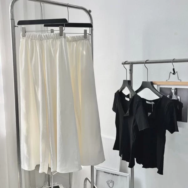 Set Áo Zip Đen Cổ V Mix Quần Suông Be Lụa Sần Ống Rộng Form Xoè Siêu Xinh