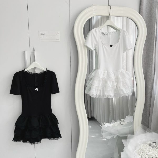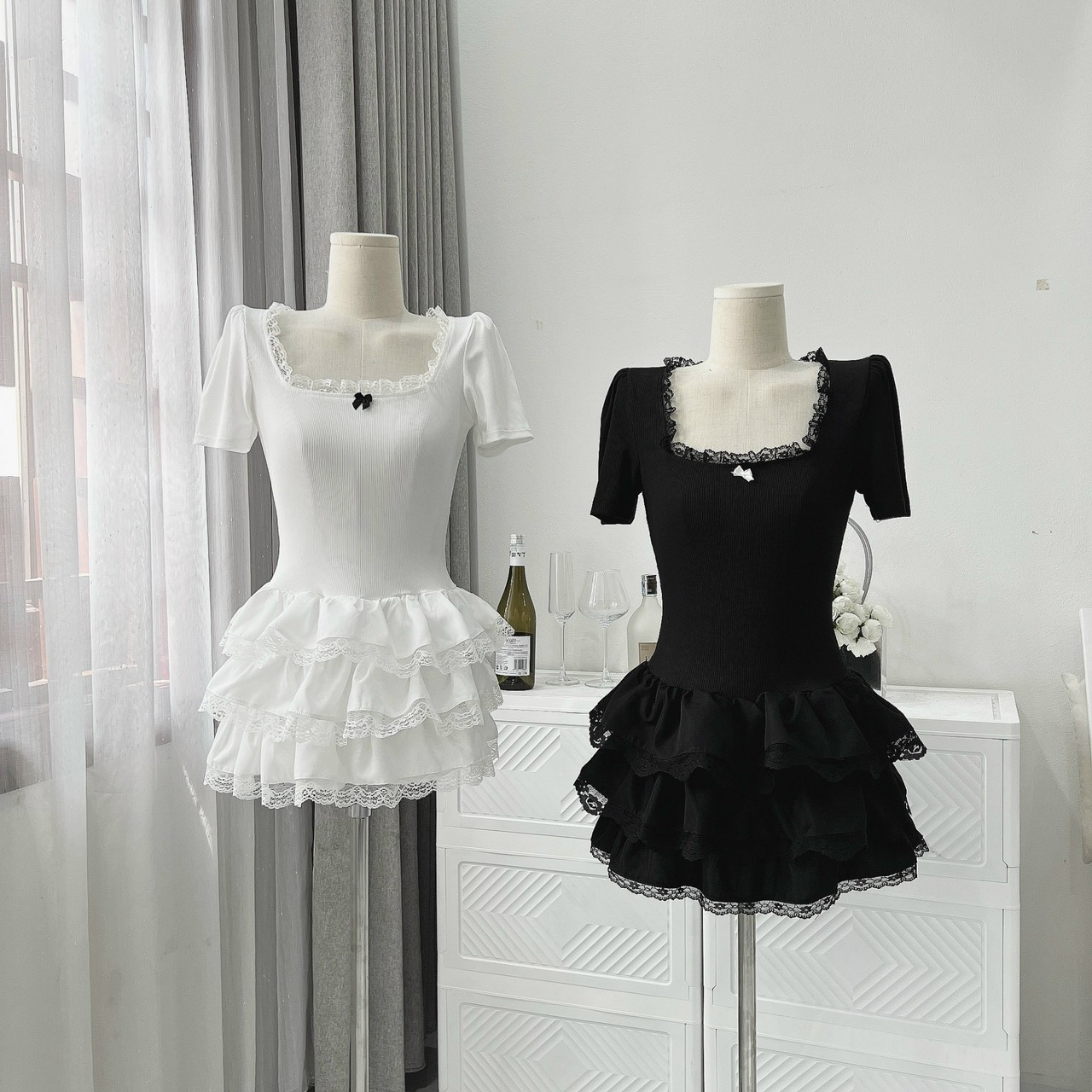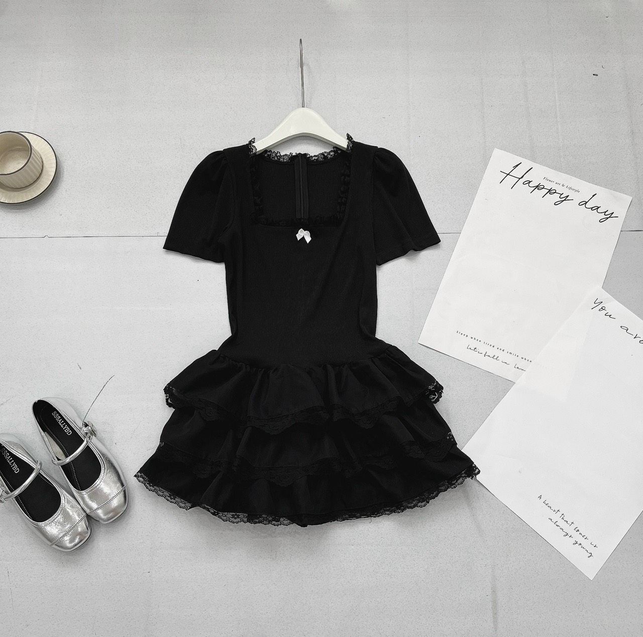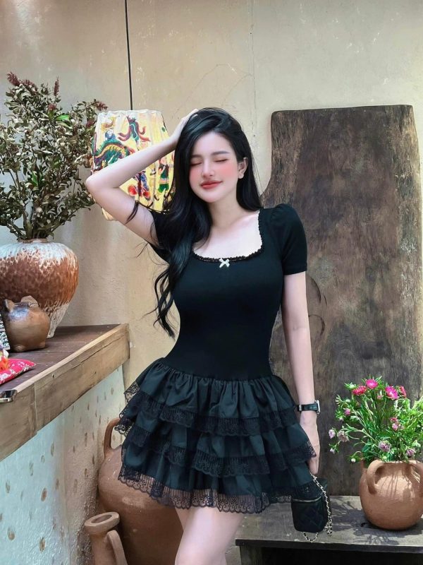 Váy Body Cổ Vuông Phối Ren Nơ Chân Váy Tầng Gấu Kết Hợp Ren Hiện Đại Có Quần Bảo Hộ
