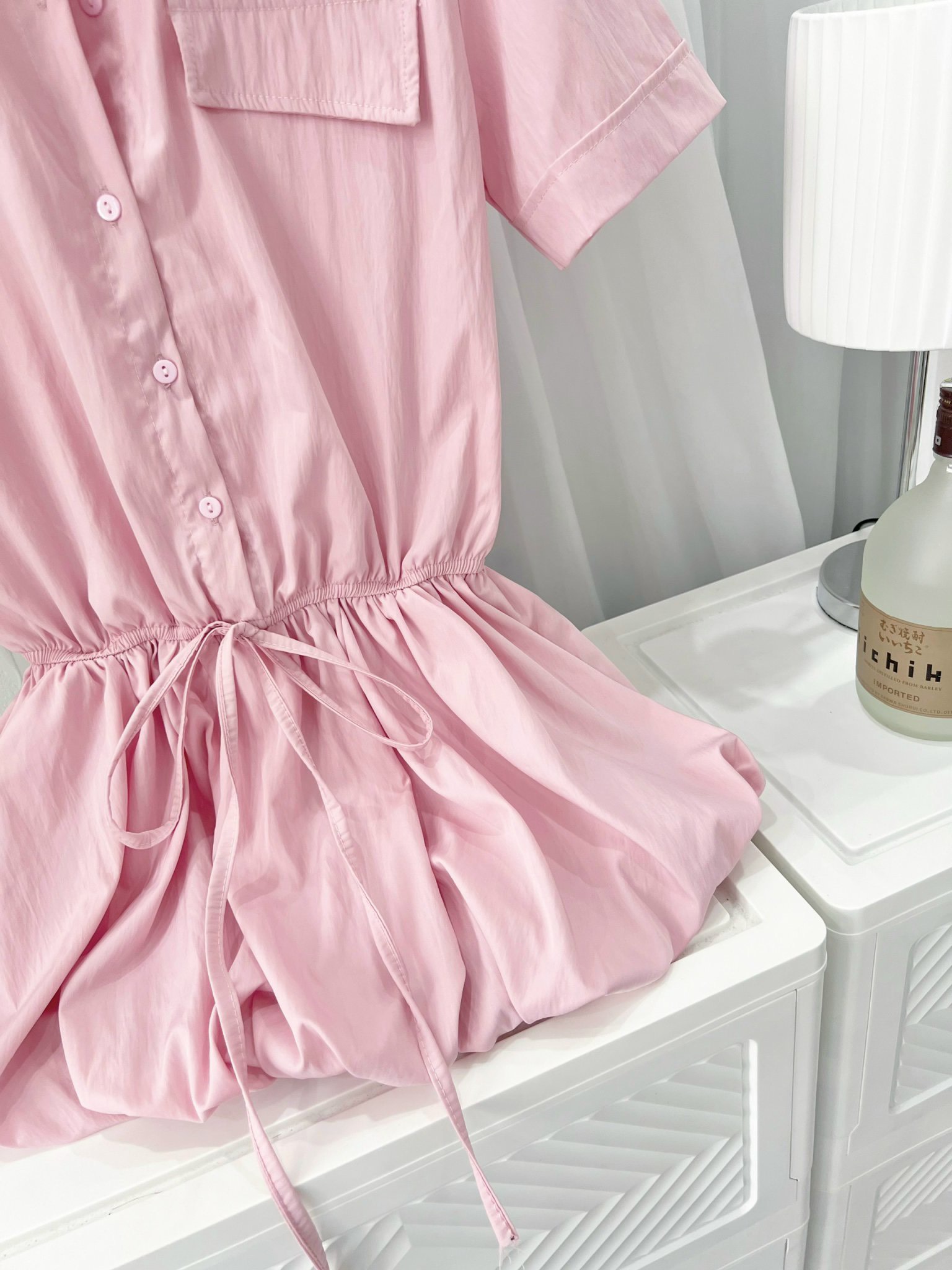 Váy Gió Nhăn Hồng Cổ Sơmi Dáng Bí Phồng Có Lót Quần Kèm Áo 2 Dây Rời