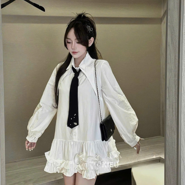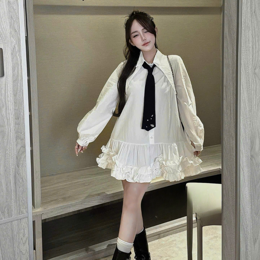 – Váy xinh tiểu thư,váy sơ mi cổ nhọn phối chân váy bèo kèm cà vạt siu xinh