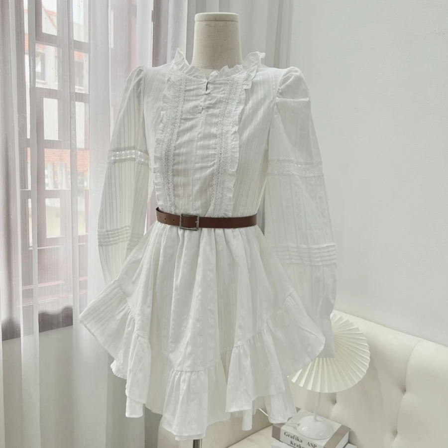 Váy Thô Ren Trắng Kèm Đai Dáng Xoè Có Lót Kèm Ảnh Thật